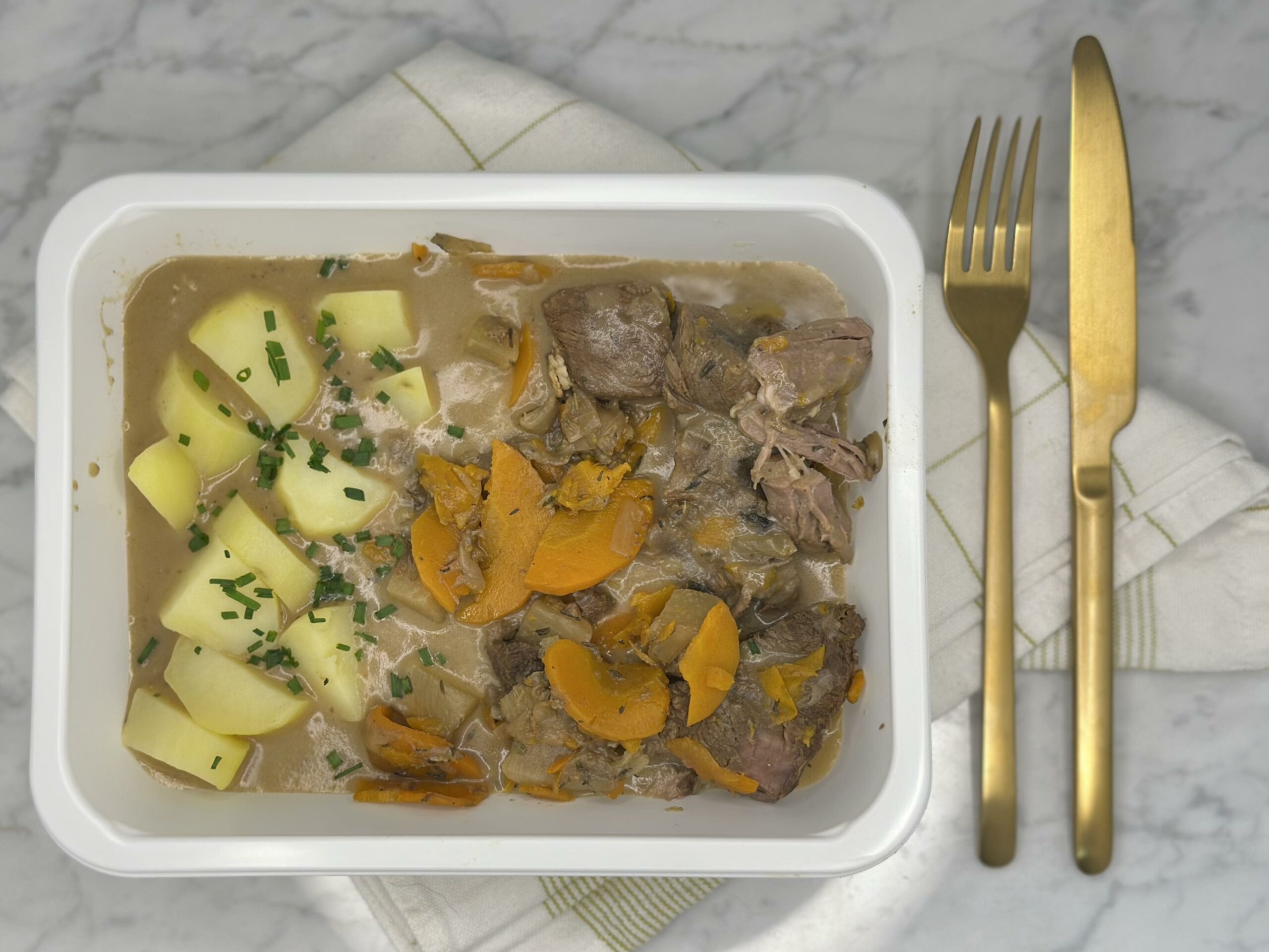 Rundvlees (Franse oorsprong) 21%, aardappel, water, wortel 7%, ui, bouillon, raap, MELK, ROOM, BOTER, witte wijn, BLOEM (GLUTEN), zout, peper.