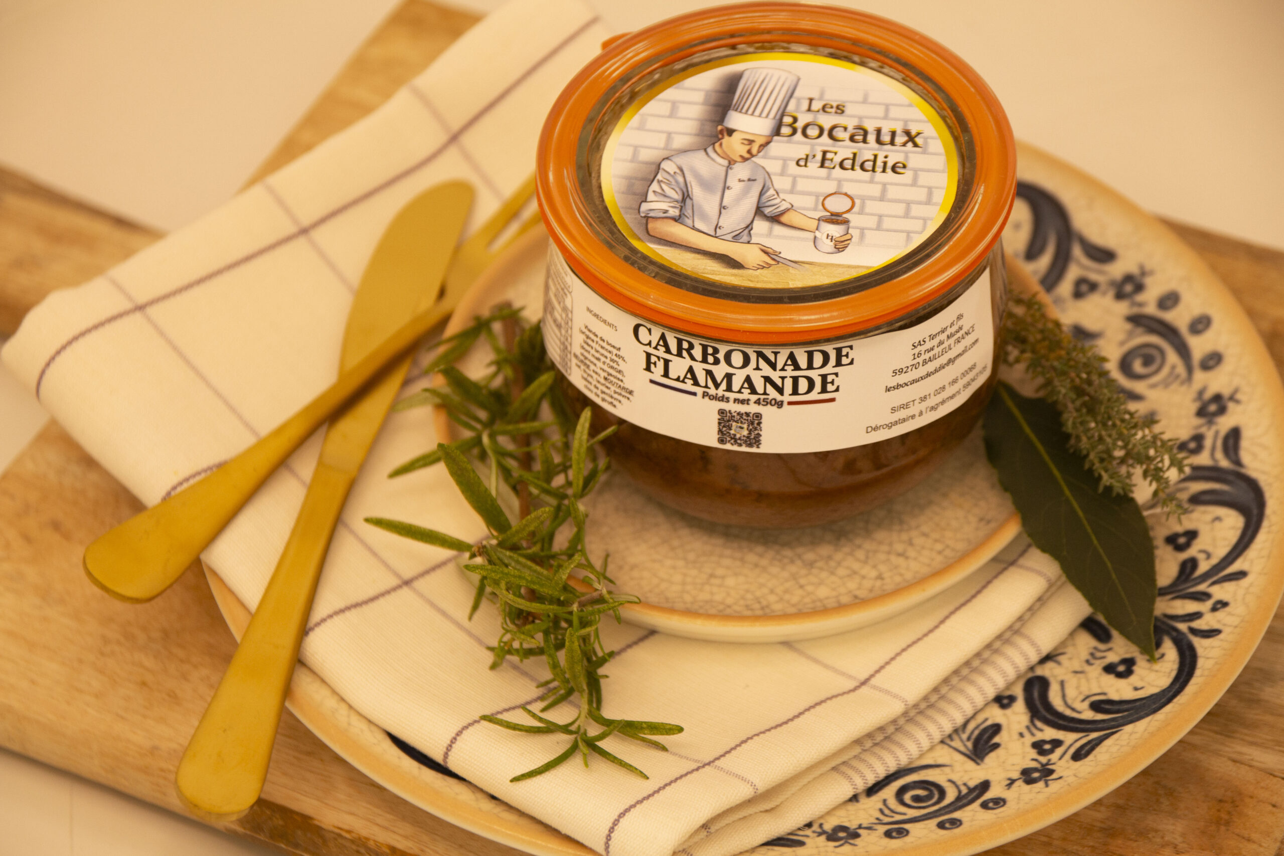 Rundsvlees 46%, bruin bier 34% (bevat GLUTEN), uien, bruine suiker Vergeoise, water, aardappelzetmeel, boter (bevat LACTOSE), MOSTERD, zout, tijm, peper, laurierblaadjes, jeneverbessen, kruidnagels. Herkomst vlees: Frankrijk.