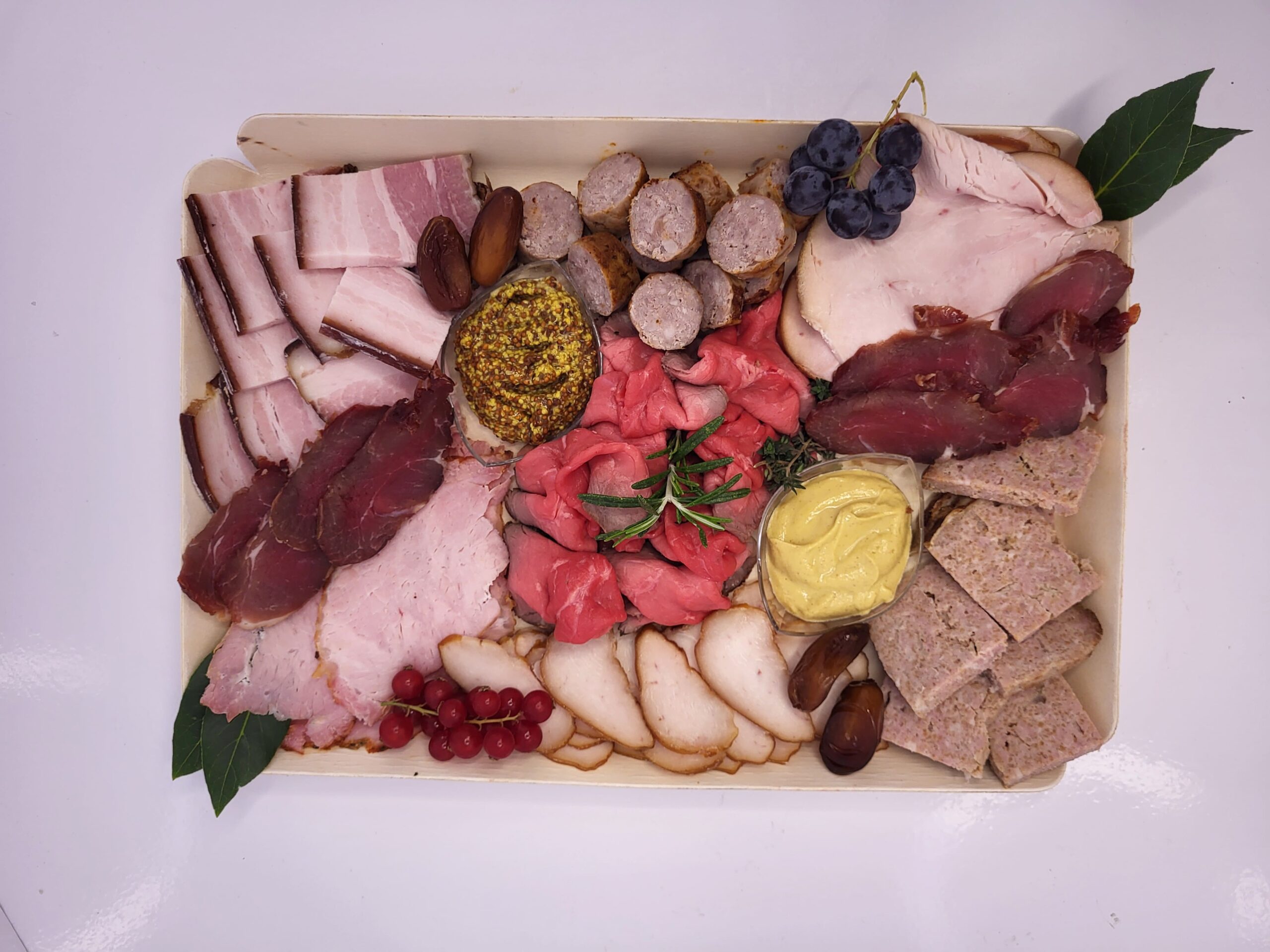 Assortiment de viandes cuites (lard, rosbeef, rôti de porc, poulet braisé, rôti de dinde, magret fumé, saucisse, pain de veau), accompagné de moutarde, décor fruits