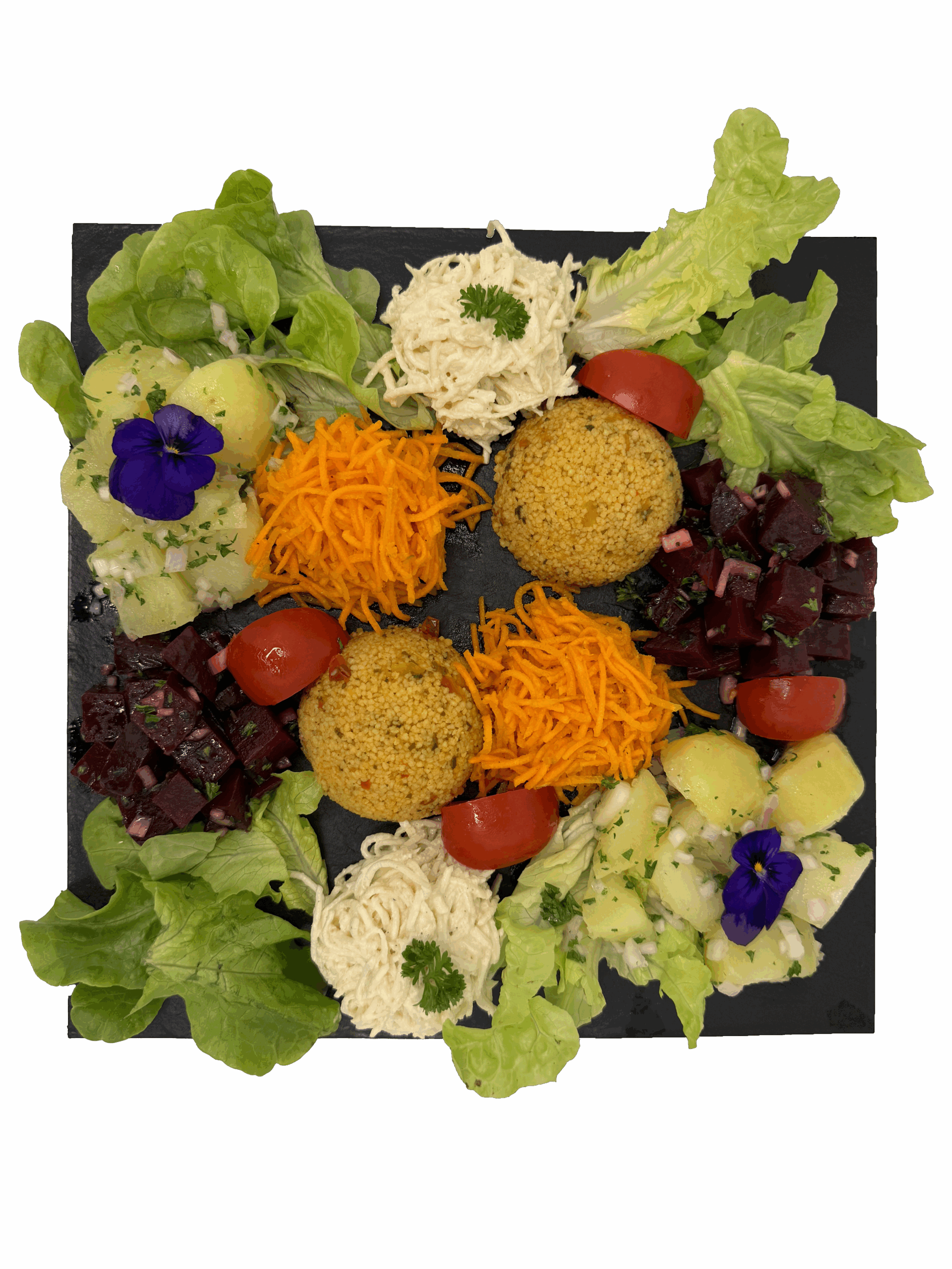 5 sortes de crudités: Carottes râpées, Cèleri rémoularde, Taboulé, Betterave rouge, Pomme de terre persillées