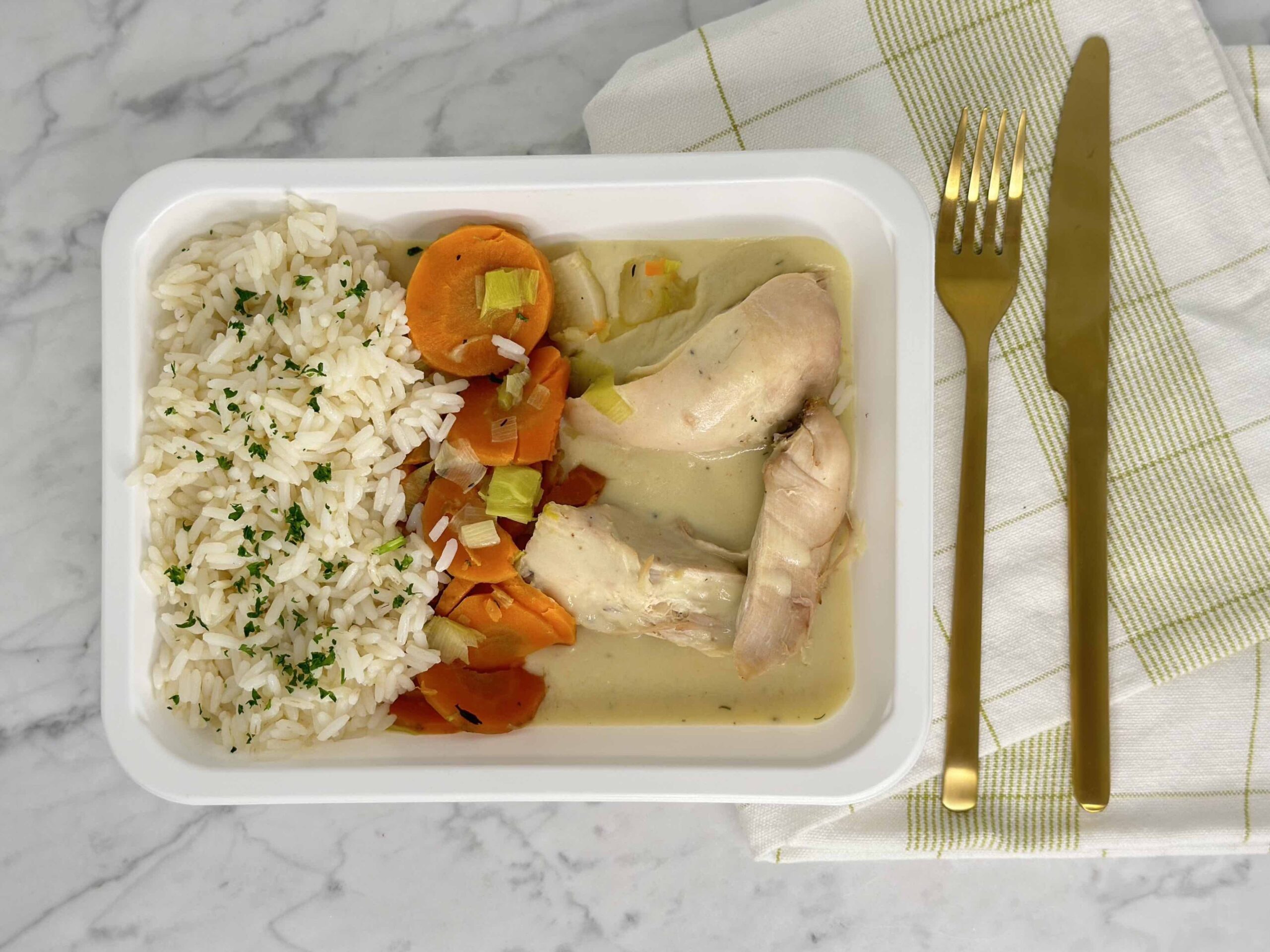 Poulet 28% (origine de France), LAIT, CREME, carotte, riz 10.4%, poireau, navet, oignon, BEURRE, FARINE (GLUTEN), sel, poivre, muscade.