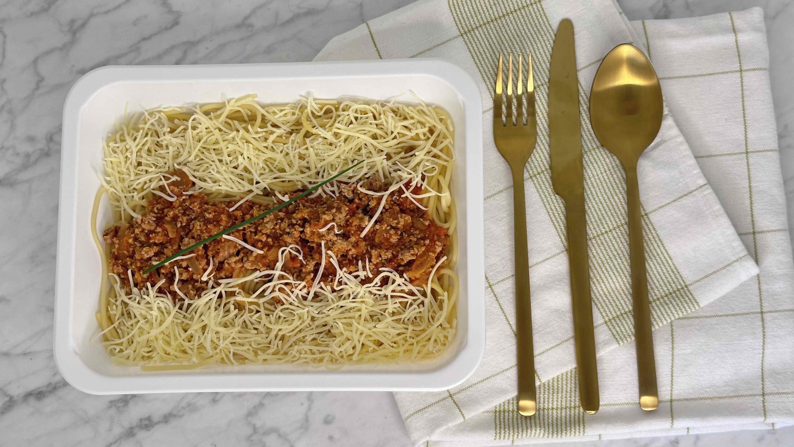 SPAGHETTI 39,5% (EIREREN, GLUTEN), Varkensvlees (afkomst: Frankrijk) 30%, tomaten 10%, BOTER, BLOEM (GLUTEN) , EMMENTALER (KAAS),